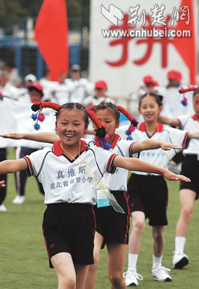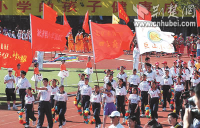 全國(guó)首屆希望小學(xué)運(yùn)動(dòng)會(huì)昨日在北京開幕,來自大別山下英山縣石頭嘴鎮(zhèn)希望小學(xué)的20名學(xué)生代表,向首都觀眾展現(xiàn)了湖北少年勤奮好學(xué),勇于拼搏的形象。據(jù)了解,中國(guó)青少年發(fā)展基金會(huì)發(fā)起實(shí)施希望工程15年來,已資助250多萬名農(nóng)村貧困學(xué)子,援建希望小學(xué)萬余所。湖北日?qǐng)?bào)記者 王威 攝