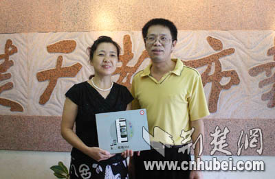 張女士在丈夫陪同下到楚天都市報領取獎品