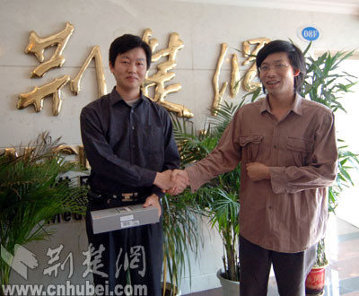 荊楚網(wǎng)24日訊 記者艾丹 潘頔 報道:23日抽出的“讀報紙、發(fā)短信、中手機”活動的兩位幸運獲獎?wù)撸錆h的李先生和谷城的孟先生,今天下午來到荊楚網(wǎng)領(lǐng)獎,荊楚網(wǎng)總編輯閻思甜親自為他們頒獎。