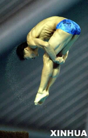 9月28日,陜西隊選手田亮在男團十米跳臺的比賽中。最終,他以275.25分的成績獲得該項目第一名。當日,在南京進行的第十屆全國運動會跳水男子團體比賽中,陜西隊以2155.25分的總成績獲得銅牌。(新華社記者孟永民攝)