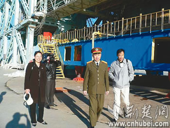 發(fā)射完畢后,酒泉衛(wèi)星發(fā)射中心參謀長(zhǎng)吳年生帶領(lǐng)湖北老鄉(xiāng)參觀發(fā)射架。本報(bào)通訊員李福元攝