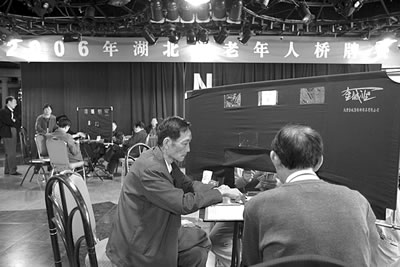 荊楚網(wǎng)消息(湖北日報)(通訊員洪海)由省橋牌協(xié)會主辦的2006年全省老年人橋牌賽昨日起在漢舉行。共有來自全省各地的22支老年人橋牌隊參加了角逐。比賽將進(jìn)行四天時間,每天進(jìn)行5輪比賽,每輪為10副牌。參賽者中年齡最大的達(dá)84歲。