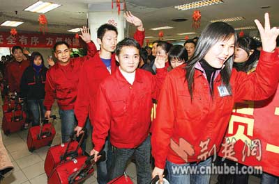 昨晚8時30分,統一著深紅服裝,拖著相同的紅色拉桿皮箱,89名湖北籍在浙江的農民工微笑著走出武漢天河機場。