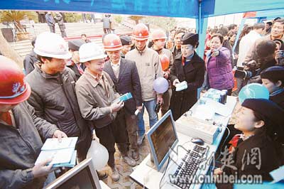 昨日,武漢市總工會(huì)大院內(nèi),農(nóng)民工“平安返鄉(xiāng)”票務(wù)趕集會(huì)正在舉行。武漢鐵路局、湖北公路客運(yùn)集團(tuán)等單位在這里擺臺(tái)設(shè)點(diǎn),共同為農(nóng)民工提供票務(wù)預(yù)訂服務(wù)。來自武漢市16個(gè)單位的500多名農(nóng)民工代表參加了趕集會(huì)。(記者張磊江卉通訊員賀鵬攝)