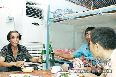 記者走進(jìn)一間宿舍,頓時(shí)感受到了空調(diào)吹出的絲絲涼氣,顯示溫度為26℃。工人們正在喝啤酒吃晚餐,因?yàn)闆隹,沒(méi)有一個(gè)打赤膊的。大伙笑著說(shuō):往年一到夏天總為睡覺(jué)發(fā)愁,太熱了睡不好,白天做事自然沒(méi)精神,今年用上空調(diào)后,日夜心里都蠻爽。