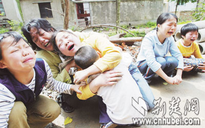 昨日上午,余行洲的妻子和5個兒女在其摔死的地方大聲慟哭,痛不欲生。當(dāng)?shù)鼐用窠榻B:余系黃陂李集人,一家人的生活全靠他在外打工維持。