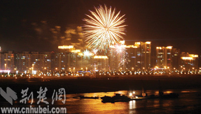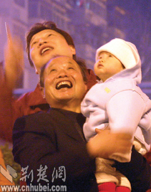 漢陽(yáng)的劉春華一大家子人特別引人注目,因?yàn)樗麄優(yōu)榇蠡镎故玖艘粓?chǎng)小型的私人焰火晚會(huì)。她的四兄弟姊妹,從面包車(chē)上扛下大包大包箱子般大小的焰火,依次在江邊擺開(kāi)。不一會(huì),幾道彩色的光柱就在天空閃耀,彩色幕布被拉開(kāi)。震耳的轟響,讓孩子們又愛(ài)又怕,躲在父母的身后偷偷地捂著耳朵跳鬧。70多歲的爺爺奶奶微笑著,安靜地看著自己十多個(gè)子子孫孫們歡暢的一幕。