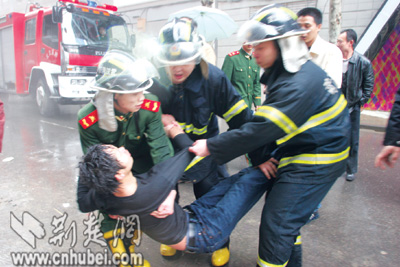 昨日上午,漢口青島路10號(hào)的鉆石酒吧在裝修中不慎引發(fā)火災(zāi),兩男子被困。危急關(guān)頭,消防兵破門(mén)而入,將二人救出。