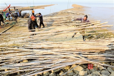一旁,駕駛著機(jī)船的漁民們,或忙著收網(wǎng),或配合將割下的竹子運(yùn)回岸邊。船只在湖面上留下道道漣漪,灘涂上抗著竹子的漁民蜿蜒成一幅畫。