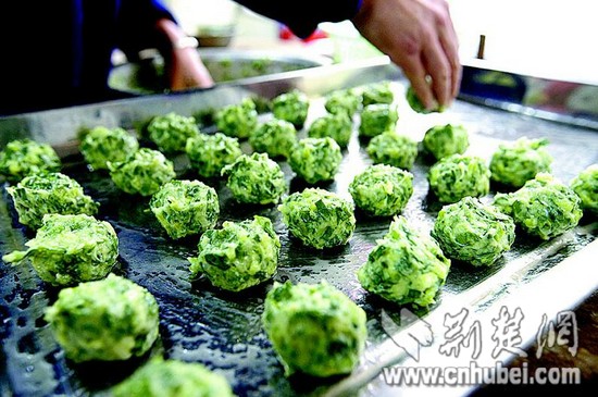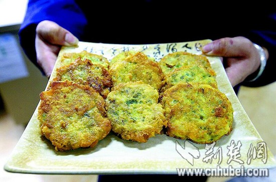 湖北日?qǐng)?bào)訊 早春,野菜餅成為咸寧市百姓一道特色佳肴。制作野菜餅時(shí),先取新鮮魚(yú)肉打成魚(yú)蓉,再將采摘的新鮮野芹菜、野韭菜等切成沫,加入魚(yú)蓉混合攪勻,制成直徑十厘米大小的小餅上蒸鍋蒸,再裹上蛋黃煎至金黃,清香撲鼻。