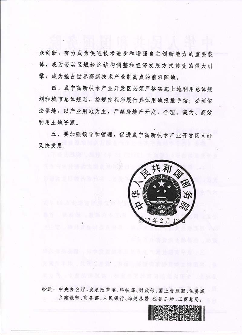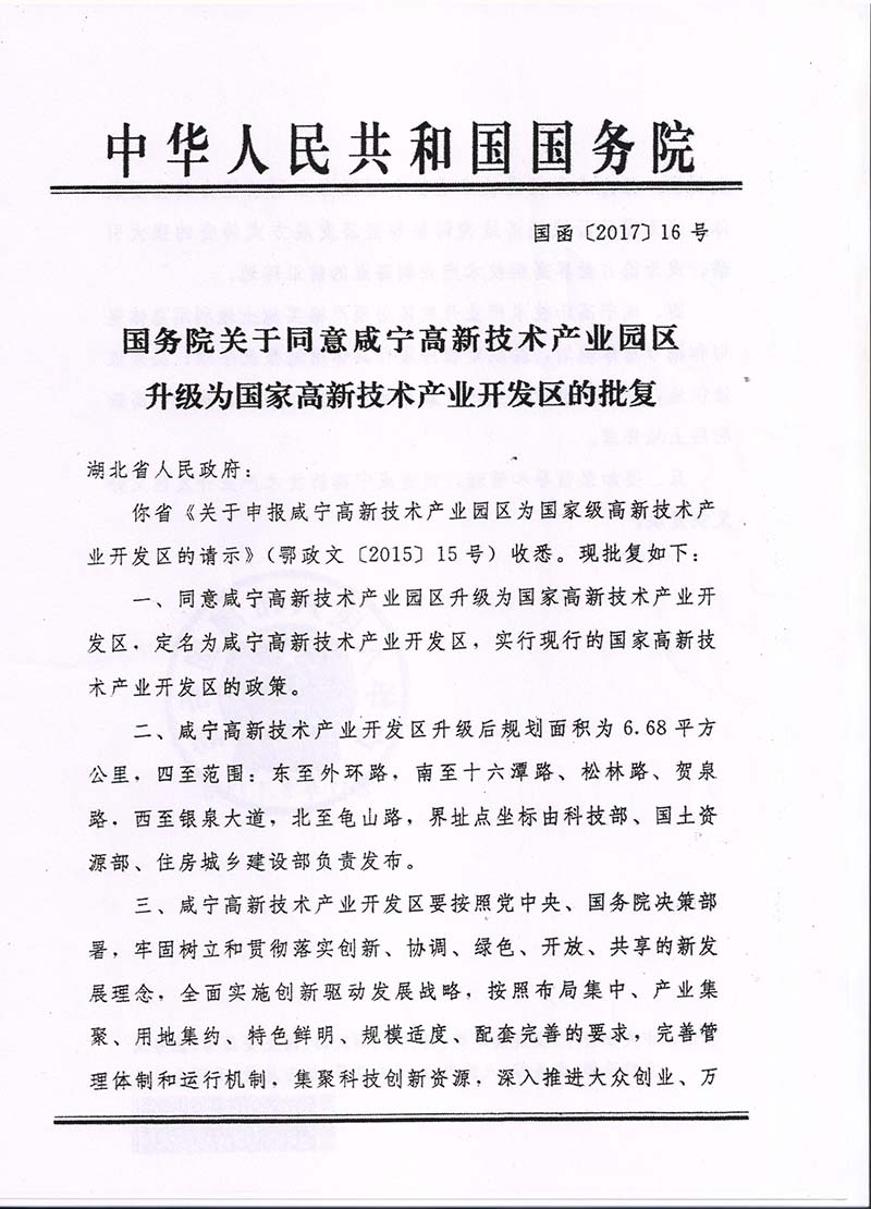 你省《關(guān)于申報(bào)咸寧高新技術(shù)產(chǎn)業(yè)園區(qū)為國家級(jí)高新技術(shù)產(chǎn)業(yè)開發(fā)區(qū)的請(qǐng)示》(鄂政文〔2015〕15號(hào)) 收悉?,F(xiàn)批復(fù)如下: