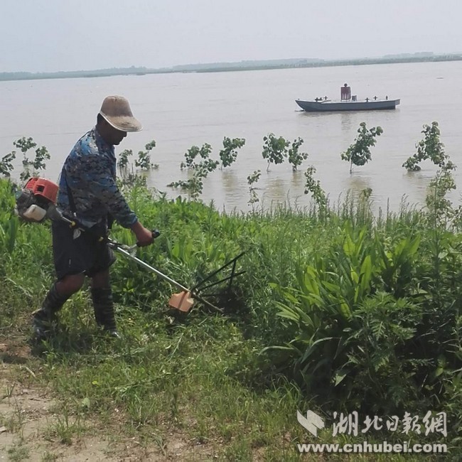 站在簰洲灣堤上,只見江水寬闊,水質(zhì)混濁,岸邊的防浪林樹干已被淹沒大半,只露出一蓬蓬的樹枝。原本空曠的堤頂公路,多了一些哨棚。內(nèi)岸邊,星散分布的群眾,手持鐮刀或除草機(jī),正在忙碌地清障除雜。每隔一段距離,都有一個防汛哨屋,鮮艷的五星紅旗迎風(fēng)飄揚(yáng),各個分指揮部已經(jīng)設(shè)立。