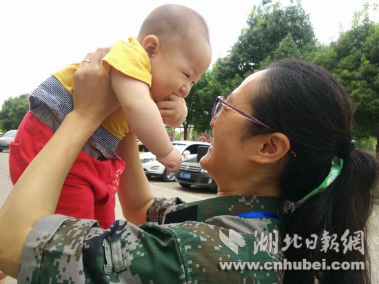 湖北日報(bào)網(wǎng)訊(全媒體記者 張愛虎 通訊員 江開群 秦修)6日上午8時(shí)30分,嘉魚縣陸溪鎮(zhèn)鎮(zhèn)長路紅云,到縣防指辦理防汛物資報(bào)領(lǐng)手續(xù),忙完后下樓,正是9時(shí)10分,見到婆婆抱著5個(gè)多月的兒子蕗熙趕來。乘著采訪的間隙,一身戎裝、皮膚黧黑的路紅云抱著兒子逗玩。