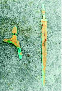 圖為:出土的青銅劍和戈