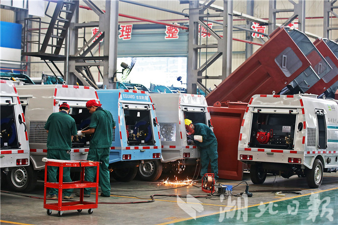 8月8日,湖北合加環(huán)境設備有限公司的工人正在裝配環(huán)衛(wèi)車。(記者梅濤 攝)