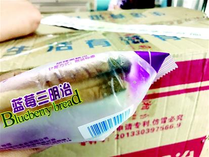在該校三樓,記者看到了一袋發(fā)霉的面包,包裝上寫著“藍莓三明治”,生產(chǎn)日期是2018年5月14日,保質(zhì)期180天,生產(chǎn)廠家是“湘潭鄭福記食品有限公司”。這袋面包有三片,其中一角已經(jīng)發(fā)霉變黑。