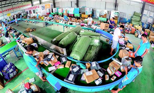 6月29日,赤壁市康華物流園快遞分撥中心,員工正在傳送帶上按區(qū)域分揀包裹。50余家物流、倉儲企業(yè)入駐該園,每天約有2.8萬件包裹進出。赤壁市整合物流資源,實行統(tǒng)一收寄處理,快遞效率提高了,派件成本降低約20%,寄件成本降低50%以上。