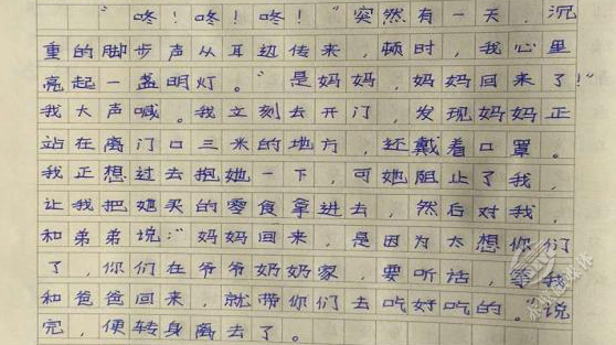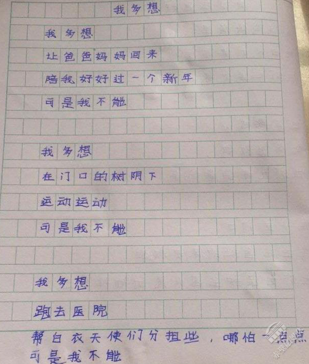 夫妻倆的大寶二寶,被托付給爺爺奶奶照料。多日不見父母,他偷偷寫下一首詩(shī)《我多想》:“我多想,讓爸爸媽媽回來(lái),陪我好好過一個(gè)新年,可是我不能……我多想,跑去醫(yī)院,幫白衣天使分擔(dān)一些,哪怕一點(diǎn)點(diǎn),可是我不能……”字里行間,流溢出滿滿的思念。
