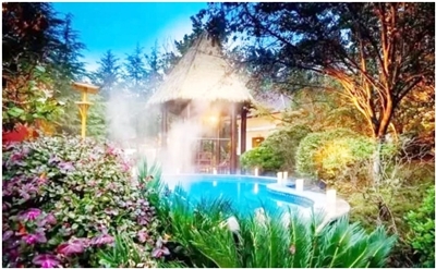 碧桂園的泉眼從上至下流,40多種湯池依據(jù)地勢(shì)高低而建。有一處名為“桂花湯”的泡池,泡池內(nèi)不僅添加了桂花的香料和養(yǎng)顏保膚的秘方,池子底部還散出金黃色的光束,隨起伏的水波搖晃,深得考察團(tuán)女性的喜愛(ài)。
