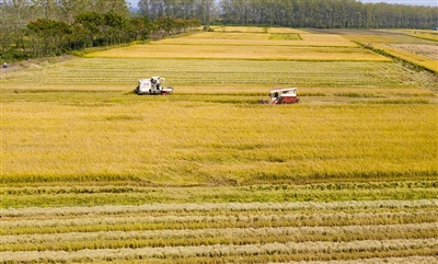 13日,嘉魚簰洲灣田野一片金黃,40000多畝晚稻田里,幾十臺收割機(jī)、運(yùn)輸車一片忙碌。