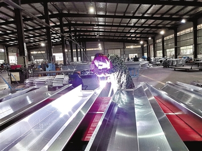 在中港金屬制造有限公司車間外,一輛加長貨車正在裝運(yùn)送往武漢的成品。車間里,焊花飛濺,工人們正在熟練地完成原材料開料、折彎、焊接、拋光等工序。