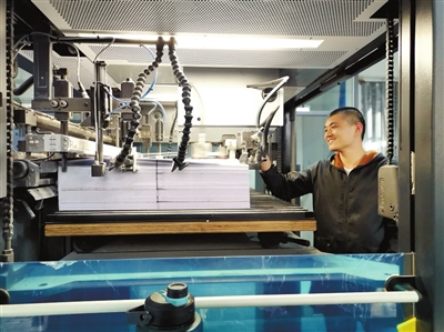 3月3日,記者在山河文化發(fā)展有限公司看到,車間里機(jī)聲隆隆。在一個大型流水機(jī)器旁,一名員工專注地放紙,隨后機(jī)械打印、切割、檢驗(yàn)、裝訂成書……人機(jī)配合十分默契。