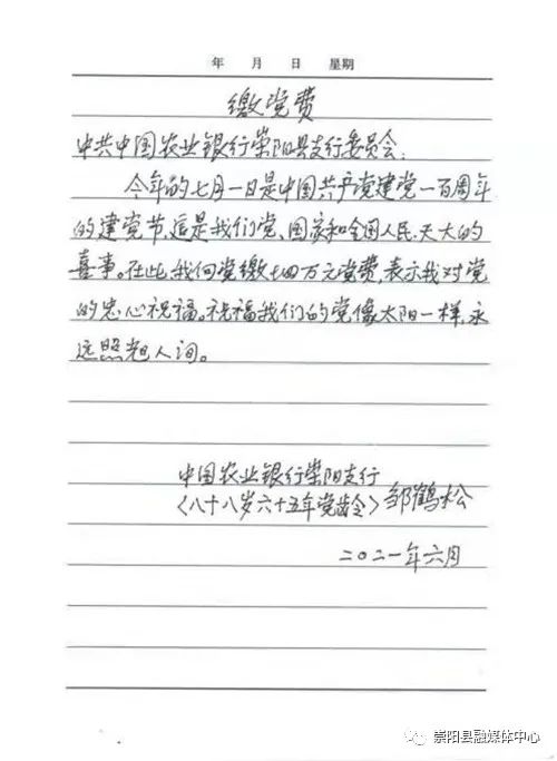 廖海峰告訴記者,來(lái)之前,鄒鶴松老人特意向中國(guó)農(nóng)業(yè)銀行崇陽(yáng)支行黨委寫(xiě)了一封信,信里這樣寫(xiě)著:“今年是中國(guó)共產(chǎn)黨建黨100周年,這是我們黨、國(guó)家和全國(guó)人民天大的喜事。在此,我向黨繳納4萬(wàn)元黨費(fèi),表示我對(duì)黨的衷心祝福。祝福我們的黨像太陽(yáng)一樣,永遠(yuǎn)照耀人間。”一句句簡(jiǎn)單樸實(shí)的語(yǔ)言,彰顯著一名老黨員赤心向黨、一心為黨樸實(shí)而偉大的情懷。