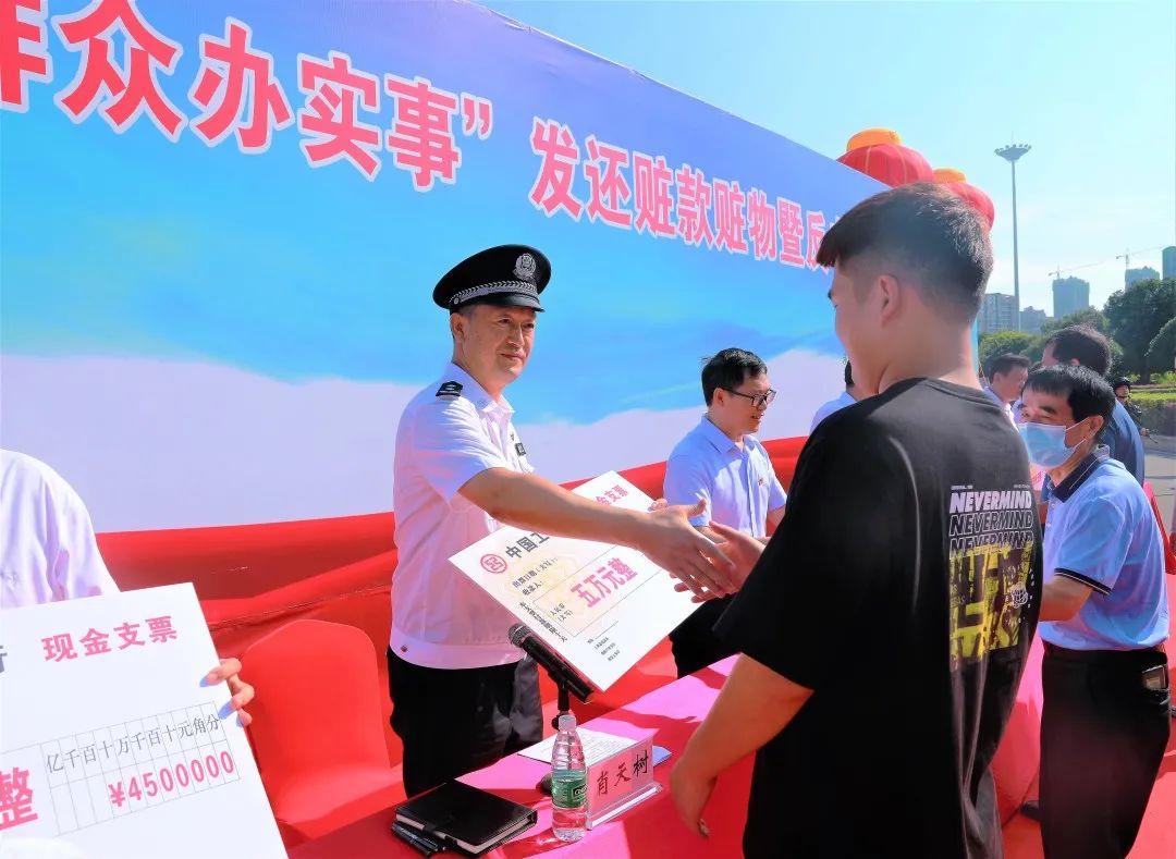 6月24日上午,全市政法機(jī)關(guān)隆重舉行“我為群眾辦實(shí)事”發(fā)還贓款贓物暨反電詐宣傳大會(huì),集中返還在偵察破案中追繳的部分贓款,以及汽車、筆記本電腦、手機(jī)、煙酒、郵票等被盜、被騙贓物,總計(jì)價(jià)值5038.6萬(wàn)元,彰顯了公安機(jī)關(guān)的打擊戰(zhàn)果,震懾違法犯罪,進(jìn)一步提升人民群眾安全感和滿意度。
