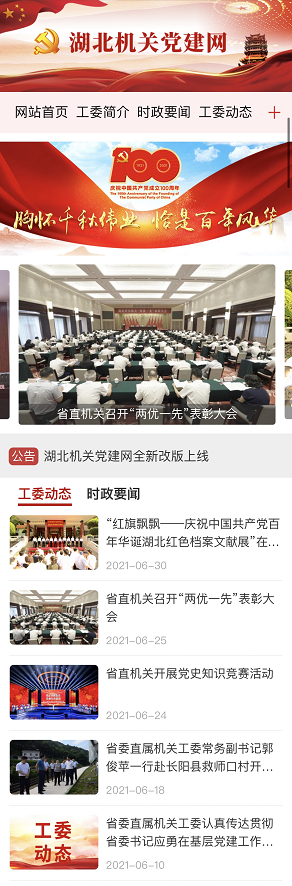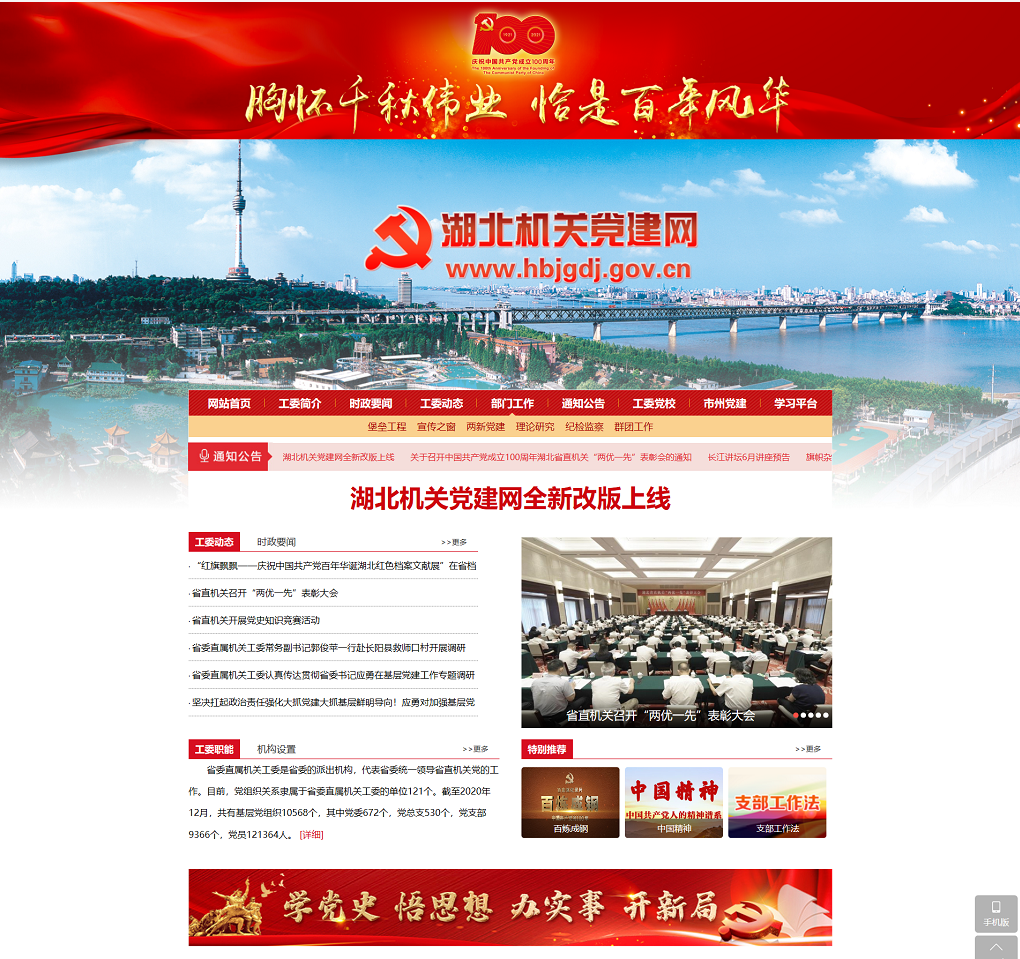 荊楚網(wǎng)(湖北日?qǐng)?bào)網(wǎng))訊(記者謝頤 通訊員鄭羽嬋)在中國(guó)共產(chǎn)黨成立100周年之際,湖北機(jī)關(guān)黨建門(mén)戶(hù)網(wǎng)站湖北機(jī)關(guān)黨建網(wǎng)(http://www.hbjgdj.gov.cn/)電腦端、移動(dòng)端全新改版上線(xiàn)。這是省委直屬機(jī)關(guān)工委積極探索智慧黨建的有效途徑,是加強(qiáng)省直機(jī)關(guān)黨建宣傳工作的重要舉措,是為黨慶生、為黨祝福獻(xiàn)上的特殊禮物。