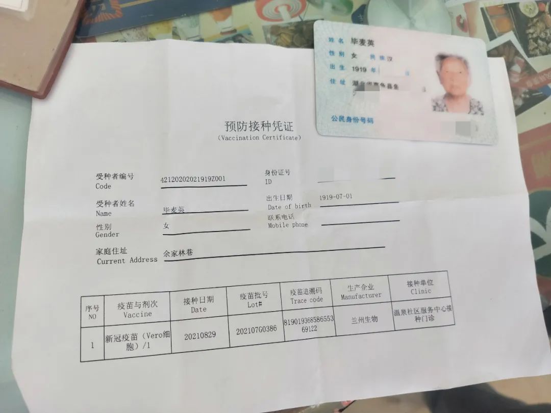 8月29日,居住在咸安區(qū)溫泉街道桂花路社區(qū)的百歲老人畢麥英,在溫泉衛(wèi)生服務(wù)中心新冠疫苗接種點(diǎn)接種第一劑次新冠疫苗,她是咸寧市目前最年長的新冠疫苗接種者。