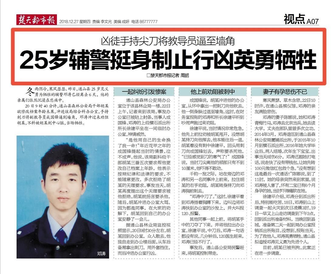 2018年12月27日,楚天都市報(bào)一篇《兇徒手持尖刀將教導(dǎo)員逼至墻角 25歲輔警挺身制止行兇英勇犧牲》的報(bào)道對這一案件進(jìn)行了詳細(xì)披露,一時(shí)間也在互聯(lián)網(wǎng)上引發(fā)強(qiáng)烈反響。之所以引起廣泛關(guān)注,只因文中那個(gè)手持尖刀的兇手,不是一個(gè)普通歹徒,而是一名人民警察。