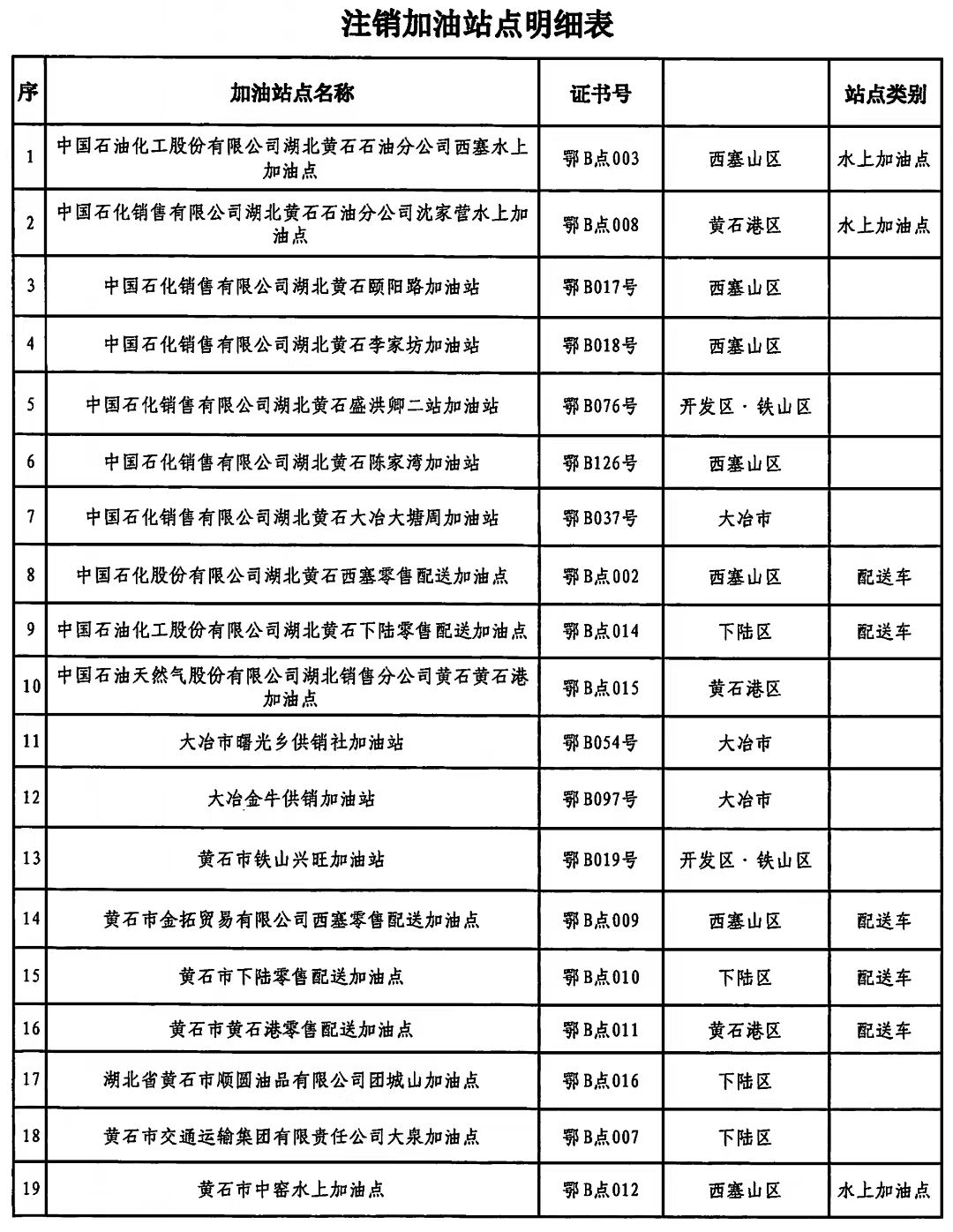 5月16日,黃石市商務(wù)局發(fā)布公告稱,注銷中國(guó)石化銷售有限公司湖北黃石頤陽路加油站等19家加油站點(diǎn)成品油零售經(jīng)營(yíng)批準(zhǔn)證書。
