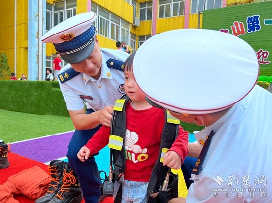 消防員將車內(nèi)一件件裝備取出來,一一介紹:“這是消防服,有很好的隔熱效果;這是照明燈,就像小朋友們家中的燈一樣,只不過可能更亮一些......”消防員耐心地講解,小朋友們認(rèn)真地聽著、記著,有的孩子更是躍躍欲試。