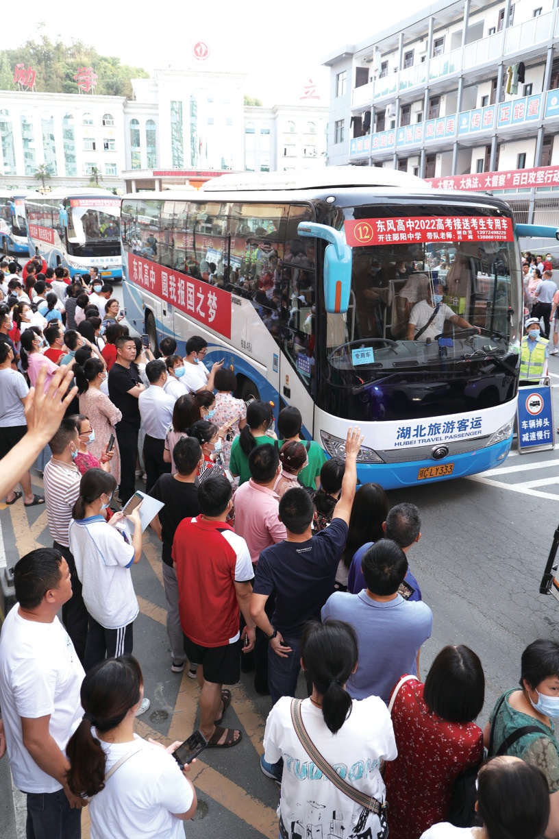東風(fēng)高中的“少年戰(zhàn)士”踏上高考的征程。車身上的標(biāo)語“圓我報(bào)國(guó)之夢(mèng)”為孩子們的夢(mèng)想做了最好注解。