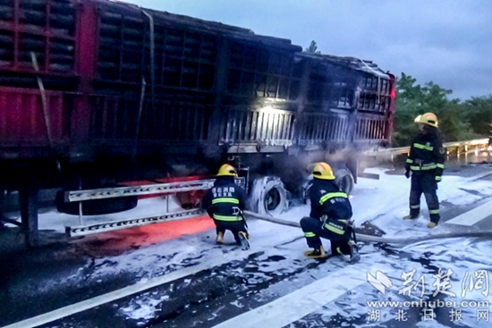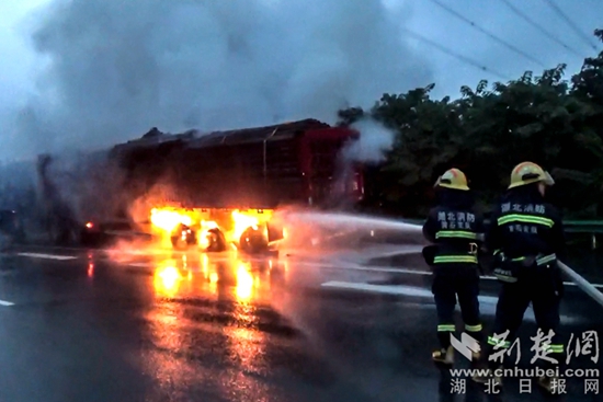 荊楚網(wǎng)(湖北日報網(wǎng))訊(通訊員 鄧弘毅)7月6日凌晨4時55分許,黃石市消防救援支隊接到報警,大廣高速黃石西通往武漢方向,一輛滿載圓木貨車著火,消防人員立即趕赴現(xiàn)場撲救。