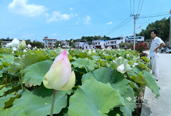 漫步在9組,17戶人家,家家戶戶門口都有一個(gè)“口袋花園”,觀賞花木,假山流水,不一而足;灣組中央盆地,“紅旗園林”已經(jīng)成型,風(fēng)吹柳樹,萬(wàn)條絲絳隨風(fēng)而動(dòng),不遠(yuǎn)處,藍(lán)天白云籠罩下,400畝蓮藕基地中荷花正盛,粉的、白的、青的花瓣被層層疊疊碩大的荷葉襯托著,“美得一塌糊涂”。
