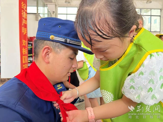 臨別之前,消防員為孩子們送上鉛筆、尺子等文具用品,孩子們依依不舍的為消防員戴上象征榮譽的紅領巾。