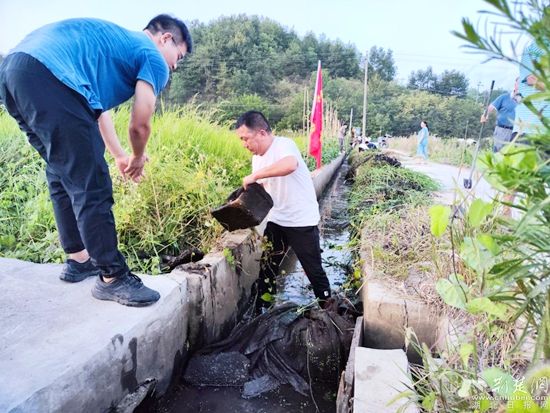 黨員沖鋒永遠(yuǎn)在一線,半人深的溝渠里,村書記郭成志一馬當(dāng)先,一頭扎進(jìn)泥溝里,揮鍬鏟沙,弄的渾身都是泥漿。6米長的涵管堵塞嚴(yán)重,他第一個跳下去,趴在狹小空間里一鍬一鏟的清理淤泥雜物。
