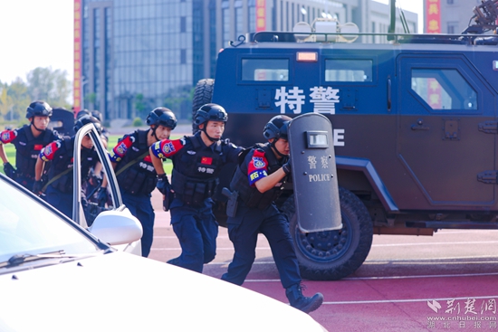 14點50分,隨著副市長、公安局長黃志勇一聲令下,警事技能大比武正式開始。大冶、陽新等7個縣(市)區(qū)公安機關(guān)和交巡警、特警等10個實戰(zhàn)單位分別進行警棍盾牌操戰(zhàn)術(shù)、擒敵拳戰(zhàn)術(shù)、實彈戰(zhàn)術(shù)射擊、應急救援等10個科目的警事技能比武。