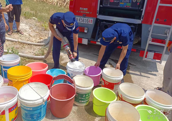 消防人員到達占昌塆村后,迅速鋪設(shè)水帶、接好水槍、打開水閥,將水注入該村的公用蓄水池和前來挑水的村民水桶里,為村民送水12噸。