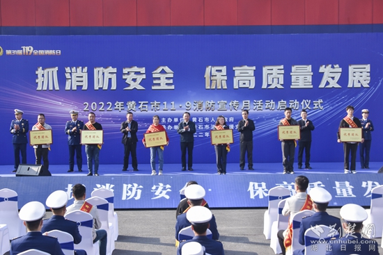 啟動(dòng)儀式上,黃石市消防救援支隊(duì)支隊(duì)長(zhǎng)程雄鷹部署了消防宣傳月相關(guān)工作,市委宣傳部副部長(zhǎng)丁元拾宣讀了《關(guān)于表彰全市優(yōu)秀消防志愿服務(wù)團(tuán)隊(duì)和消防宣傳志愿者的通報(bào)》,與會(huì)領(lǐng)導(dǎo)為獲獎(jiǎng)團(tuán)隊(duì)和個(gè)人代表頒發(fā)了獎(jiǎng)牌及證書。