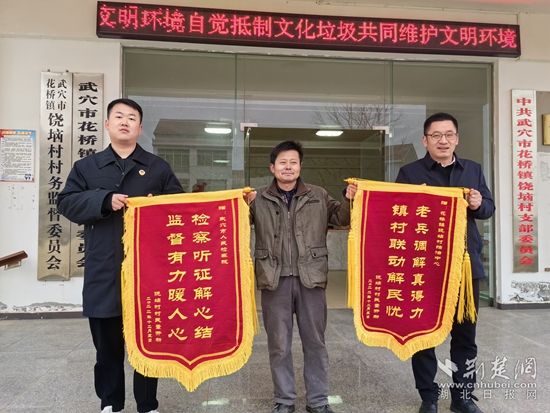 荊楚網(wǎng)(湖北日?qǐng)?bào)網(wǎng))訊(通訊員 耿文輝 趙兆)“老兵調(diào)解真得力,鎮(zhèn)村聯(lián)動(dòng)解民憂”“檢察聽(tīng)證解心結(jié),監(jiān)督有力暖人心”,12月27日,信訪戶(hù)董某甲將兩面錦旗分別送給武穴市人民檢察院和武穴市花橋鎮(zhèn)饒垴村綜治中心。
