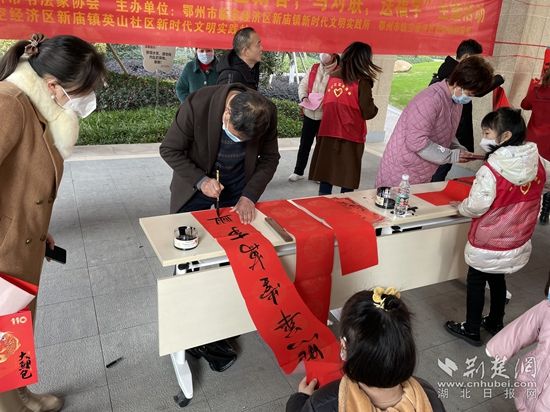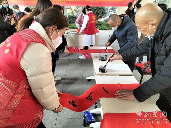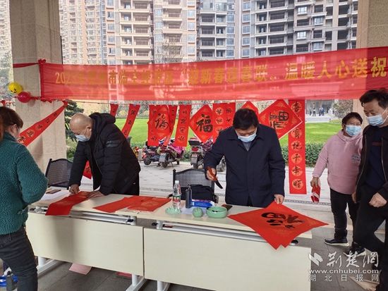 在銀海龍辰小區(qū),來(lái)自鄂州市書(shū)法協(xié)會(huì)的各位書(shū)法家現(xiàn)場(chǎng)“揮毫潑墨”,應(yīng)小區(qū)居民的要求,現(xiàn)場(chǎng)書(shū)寫(xiě)春聯(lián)和“?!弊?。此次活動(dòng),共計(jì)為居民書(shū)寫(xiě)贈(zèng)送160副春聯(lián)、100幅“福”字。