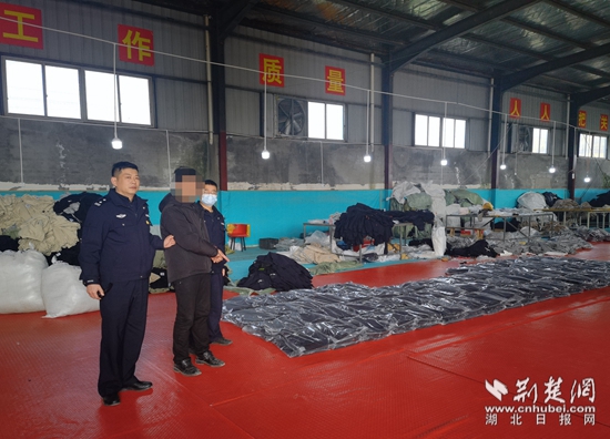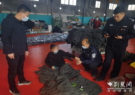 1月11日中午時分,在局領(lǐng)導的統(tǒng)一指揮下,食藥大隊聯(lián)合武穴市市場監(jiān)督管理局和打假公司等組成近30余人的查獲組,分三組分頭同步進行,一舉查獲、查封三個生產(chǎn)加工窩點,控制董某某等涉案人員10余名,現(xiàn)場查扣高仿運動品牌服裝4萬余件,涉案價值百余萬元。