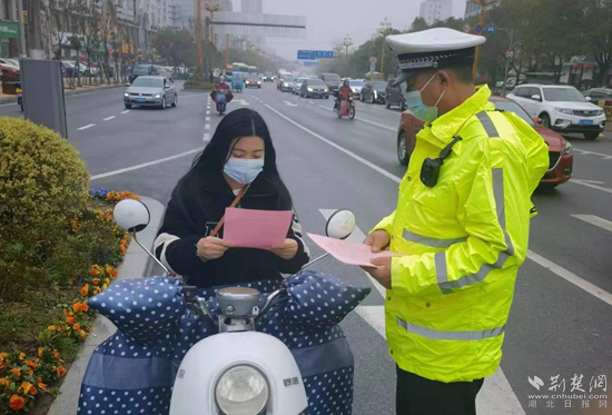 荊楚網(wǎng)(湖北日報網(wǎng))訊(通訊員肖杰、王睿)“您好,您這樣不戴安全頭盔騎行電動車非常危險……”3月21日清晨,麻城市公安局交警大隊輔警李彬正在雨中值勤,向過往車輛散發(fā)文明交通宣傳單,并對駕乘電動車不戴安全頭盔、逆向行駛、違法載人、隨意抄近路等交通違法行為進行勸導,提醒市民時刻謹記交通規(guī)則,安全文明出行。