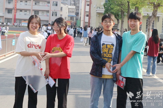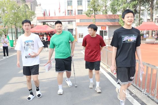他們當中有的考生身穿紅色衣服,預(yù)??荚嚧蠼?;在進考場前,有的考生圍在一起,擺出愛心的手勢,露出自信的笑容,高呼“戰(zhàn)勝高考,我能,我一定能”的口號響徹云霄;有的考生雖然在考前腿部或頭部受傷,但他們沒有顯示畏懼的神態(tài),反而展現(xiàn)了更堅強的毅力與一往無前的勇氣,面帶笑容,堅定地邁入考場……一幕幕從容的畫面詮釋著勇毅前行,一張張自信的笑臉展示著超越自我。