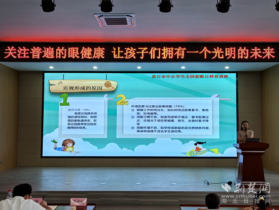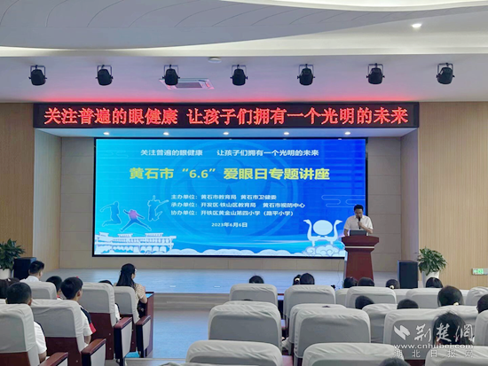 當(dāng)天,由黃石市教育局、黃石市衛(wèi)健委主辦,開發(fā)區(qū)·鐵山區(qū)教育局承辦的“6·6全國愛眼日——關(guān)注普遍的眼健康”科普教育講座活動(dòng),在黃金山第四小學(xué)舉行。