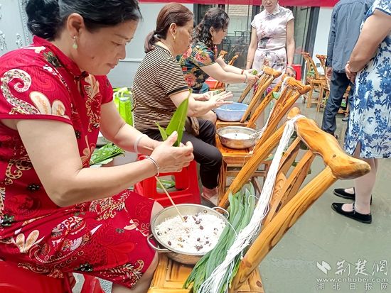 “先卷起粽葉,再填滿米,加蜜棗,再封口系繩,力道要適中?!痹诎兆訁^(qū)域,村民張嫂子作為巾幗志愿者非常耐心地教孩子包粽子。孩子們拿著粽葉幫忙放糯米,學(xué)得有模有樣。半個(gè)小時(shí)后,粽葉、糯米、粽繩等材料變成一個(gè)個(gè)棱角分明的棕子。
