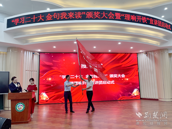 活動現(xiàn)場,出席領(lǐng)導(dǎo)為獲獎嘉賓頒發(fā)最佳創(chuàng)意獎、最佳搭檔獎、最佳作品獎、最佳人氣獎、最佳組織獎,激勵他們將黨的二十大精神記于心,踐于行,踔厲奮發(fā),篤行不怠,并共同見證了“理響開鐵”宣講團授旗儀式。