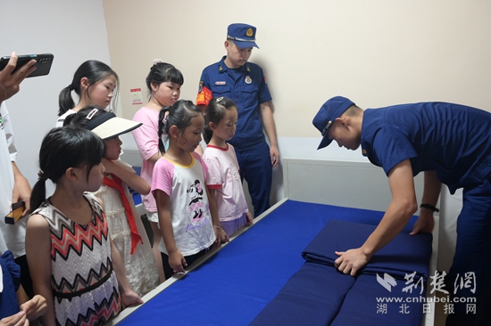 孩子們還走進(jìn)了消防員的宿舍,看到疊得如同豆腐塊般的被子,大家紛紛豎起了大拇指,都被消防員高度的自律性所震撼。消防員為青少年講解了“豆腐塊”被子的疊法,大家學(xué)習(xí)熱情高漲,紛紛模仿、動手操作。“今天的參觀讓我感受到了消防叔叔們的勇敢和擔(dān)當(dāng)。我以后也要成為一名光榮的消防員,守護(hù)大家的安全和平安?!币晃粎⒓踊顒拥男∨笥颜f道。
